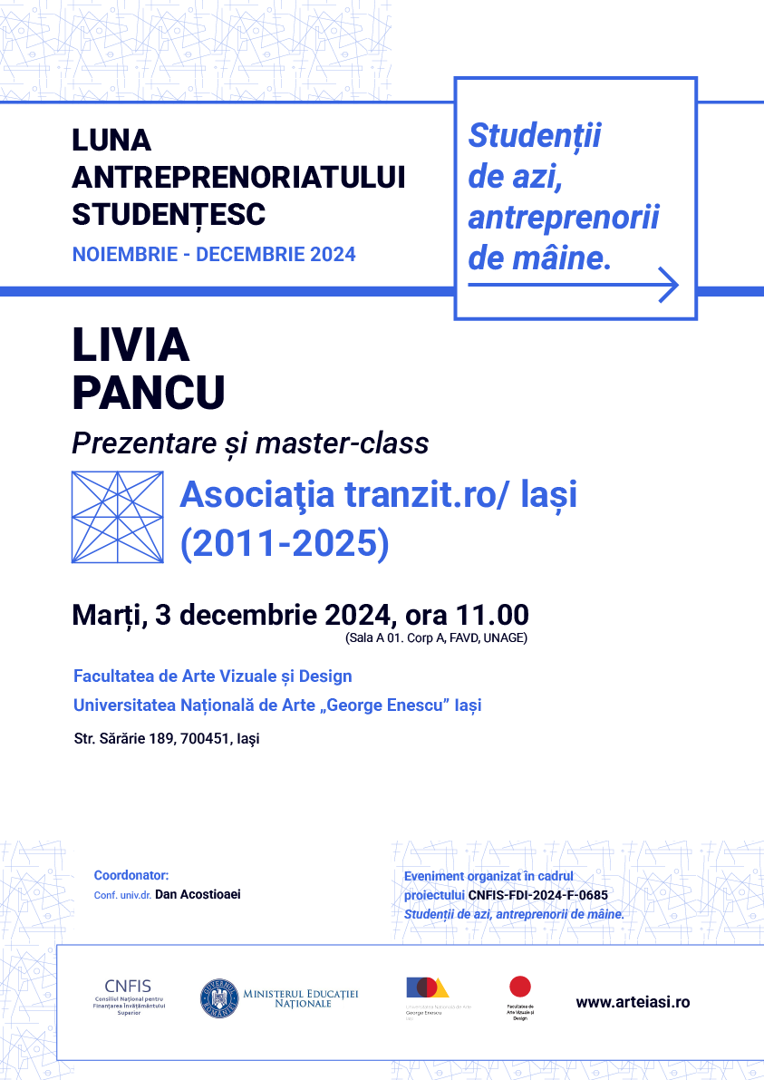 „Asociaţia tranzit.ro/ lasi ( 2011-2025)”, prezentare și master-class cu Livia Pancu