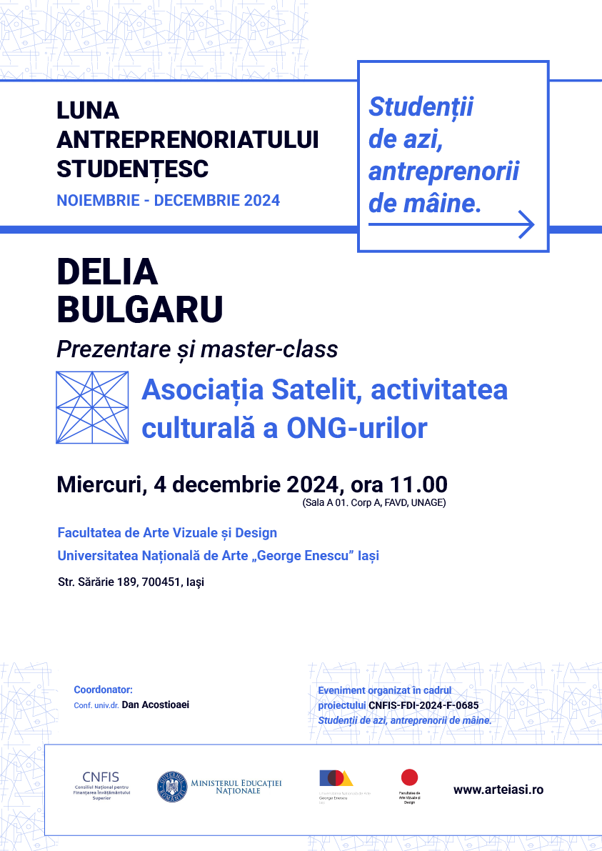 Activitățile au fost organizate în cadrul proiectului CNFIS-FDI-2024-F-0685 desfășurat de către Universitatea Națională de Arte ”George Enescu” din Iași și coordonat de către Conf. Univ. Dr. Dan Acostioaei în 2024.