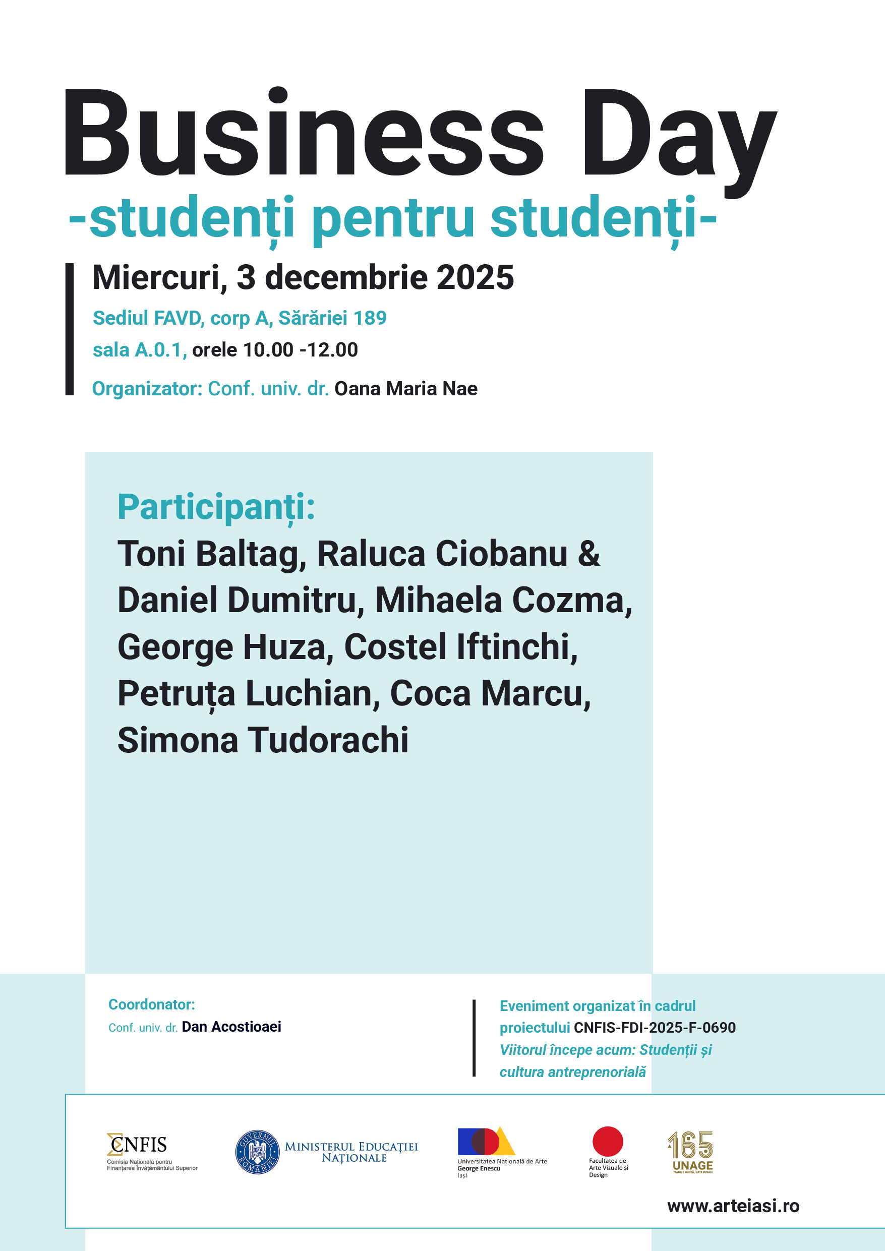 Activitățile au fost organizate în cadrul proiectului CNFIS-FDI-2025-F-0690 desfășurat de către Universitatea Națională de Arte ”George Enescu” din Iași și coordonat de către Conf. Univ. Dr. Dan Acostioaei în 2025.